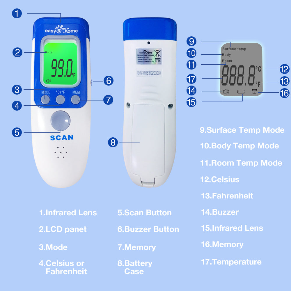 The Easy@Home 3-in-1 non-contact infrared thermometer is a quick and convenient way to measure temperature without having to make your young child hold a thermometer under their tongue or in their ear. With this IR thermometer, you can take someone's temperature while they sleep without worrying that they'll wake up. The latest infrared temperature sensor technology ensures clinical levels of accuracy and helps this laser thermometer work in just seconds.